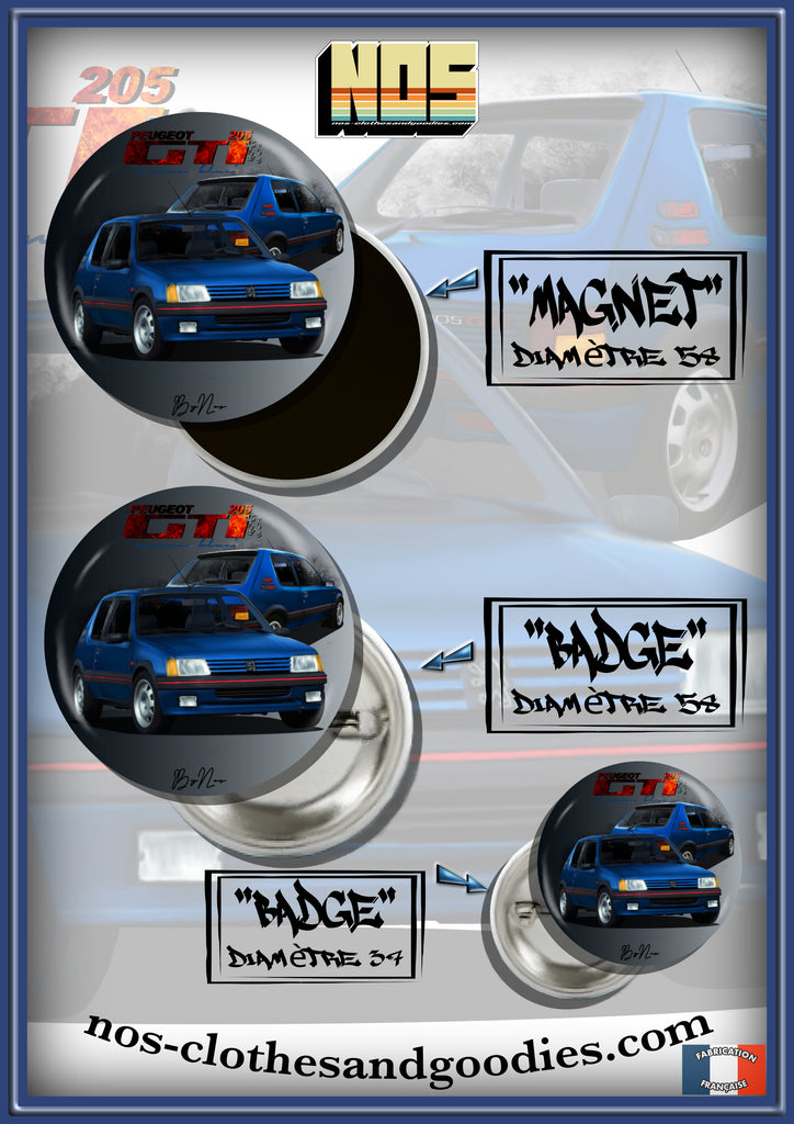 badge / magnet /porte clé décapsuleur Peugeot 205 GTI bleu Miami