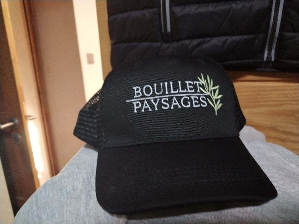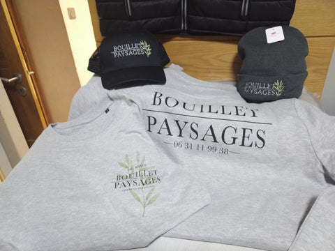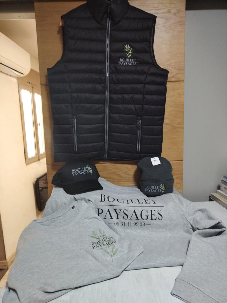 Pour un paysagiste, personnalisation sur tee shirt, sweat et broderie sur casquette, bonnet et doudoune .
